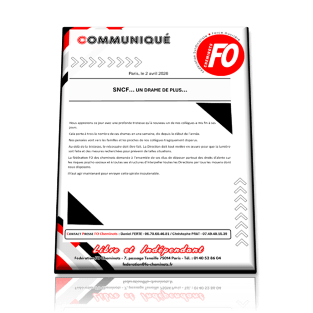 La fédération FO des cheminots demande à l’ensemble de ses élus de déposer partout des droits d’alerte sur les risques psycho-sociaux et à toutes ses structures d’interpeller toutes les Directions par tous les moyens dont nous disposons.